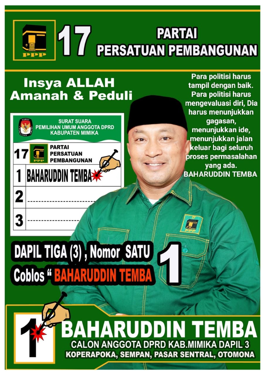 Tidak dipungkiri caleg-caleg muda atau milineal bermunculan dan turut meramaikan perebutan kursi DPRD Kabupaten Mimika, diantara sekian banyak Caleg Muda, salah satunya adalah Caleg dari Partai Persatuan Pembangunan (PPP) dari Daerah Pemilihan III Mimika Nomor Urut 1, dia adalah Baharudin Temba yang dalam taglinenya, “Jika Terpilih Siap Bekerja Dengan Tulus dan Amanah dan Siap Memperjuangkan Seluruh Kepentingan Masyarakat” ini.