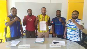 Dari Kiri : Panitia Pelaksana Musyawarah Persemi, Simon Kasamol, Yafet Wayawiyuta (Anggota Timsel), Isak Wakum (Ketua Timsel), Jhoni Tsunme (Sekretaris Timsel) dan Frans Kemong (Sekretaris Panpel Musyawarah)/Foto : Istimewa