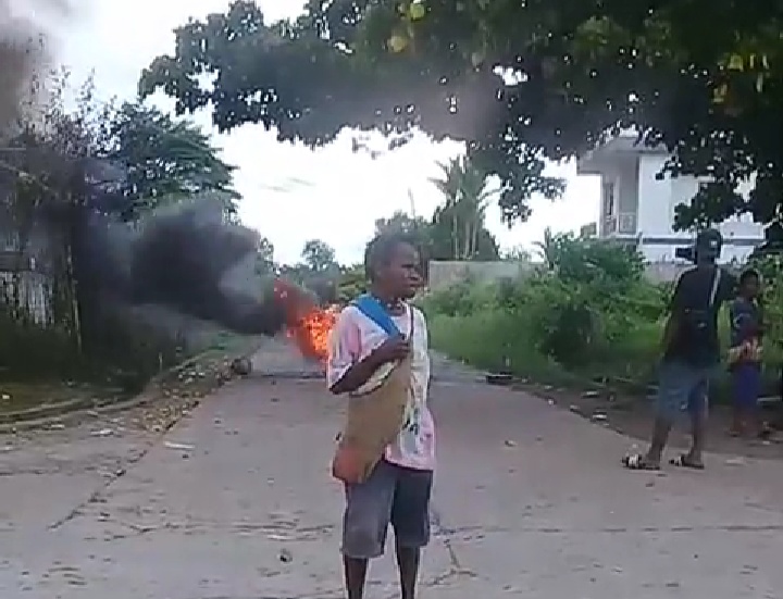 BAKAR BAN – Sejumlah Warga di Kelurahan Perintis Distrik Mimika Baru, Kabupaten Mimika pada , Rabu (22/4) melakukan pemalangan jalan dengan bakar ban bekas. Aksi bakar ban ini terjadi di area pemukiman warga di belakang Perumahan Timika Indah II, pada Rabu (22/4), sekitar pukul 16.30 WIT, yang dipicu adanya kekecewaan sejumlah warga  karena janji untuk mendapatkan bantuan Sembako dengan adanya pemberlakuan pembatasan sosial serta peningkatan status Siaga menjadi Tanggap darurat penyebaran Covid-19 di kabupaten Mimika. Mereka menagih janji dari pemerintah daerah bahwa akan memberikan bantuan sembako untuk menghadapi rencana pemberlakuan Pembatasan Sosial Berskala Besar (PBB). Akibat aksi bakar ban bekas ini, sejumlah kendaraan akhirnya memutar haluan untuk mencari jalan alternatif lain. / PEWARTA FOTO : NETIZEN WARGA – DAVID NUSALI