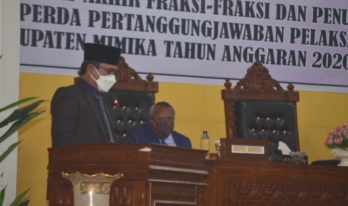 TIMIKA, (timikabisnis.com) – Fraksi Gabungan Mimika Bangkit yang terdiri dari Partai Perindo, Partai Demokrat dan Partai PSI menyampaikan enam catatan dan empat pendapat akhirnya pada dalam Rapat Paripurna I Masa Sidang IV tentang Penyampaian Catatan Rekomendasi DPRD Mimika terhadap Laporan Keterangan Pertanggungjawaban (LKPJ) Bupati Mimika tahun anggaran 2020 dan Pendapat Akhir fraksi Fraksi dan Penutupan Pembahasan Ranperda Pertanggungjawaban Pelaksanaan APBD (PP-APBD) Kabupaten Mimika tahun anggaran 2020 yang berlangsung, Jumat (9/7).
