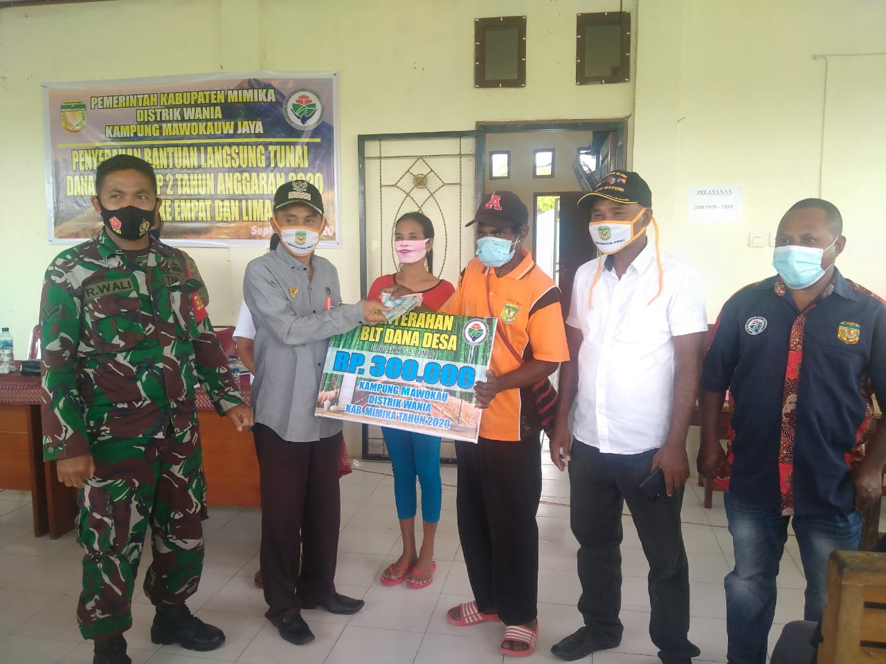 Pembagian BLT-DD berlangsung di Kantor Desa Mawokauw Jaya, pada Kamis (24/9/20) pagi turut dihadiri Kepala Distrik Wania, Richard N. Wakum, tenaga pendamping dari Dinas Pemberdayaan Masyarakat Kampung, dan para Ketua RW dan RT serta warga penerima bantuan.