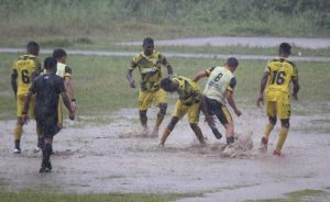 Para pemain dari Persiko Kokonao dan Pemain Cartens United berebut bola dalam genangan air dalam pertandingan babak penyisihan terakhir Pool D yang berlangsung di Lapangan Sepakbola Mayon 754 ENK, Sabtu (6/8/2022)/Foto : husyen opa