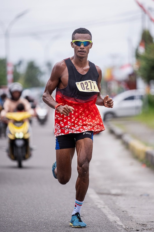 Laode Syarifrudin (0199) berhasil finish terdepan dalam perlombaan half Marathon 21 km tingkat umum dengan catatan waktu 1 jam 14 menit/Foto : Fernando Rahawarin