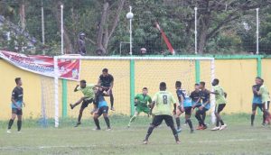 PEREBUTAN BOLA – Para pemain Aruka FC saat menggempur barisan pertahanan kesebelasa Brigif 20 IJK pada pertandingan babak semifinal kedua Kompetisi Sepakbola Putra U-23 Piala Bupati Mimika tahun 2022 yang berlansung di Stadion Wania Imipi SP 1, Distrik Wania, kabupaten Mimika, Papua, Rabu (24/8/2022)/Foto : Fernando Rio Rahawarin