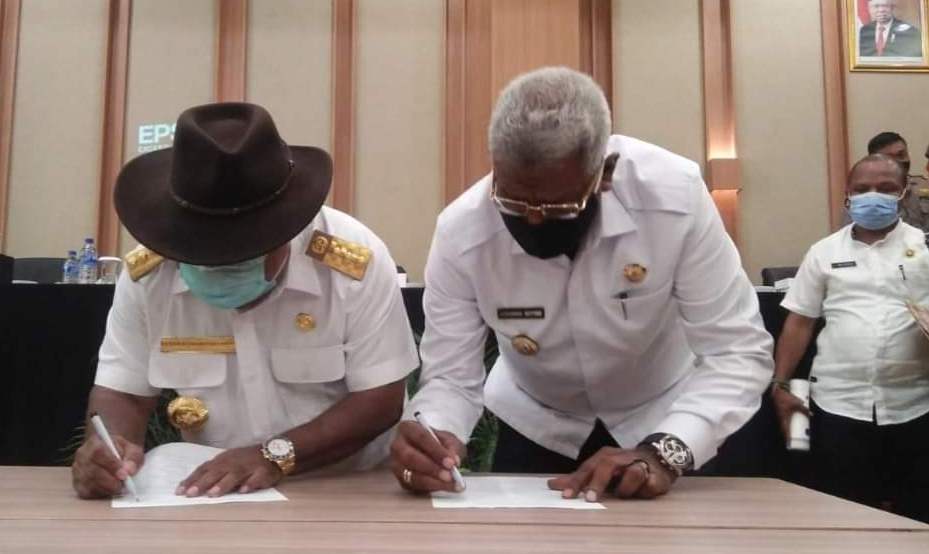 Bupati Mimika, Eltinus Omaleng,SE,MH (kiri) dan Wakil Bupati, Johannes Rettob,S.Sos, Msi saat menanda tangani Kesepakatan bersama perpanjangan status New Normal Pandemi Covid-10 di Hotel Mossa Timika/Istimewa