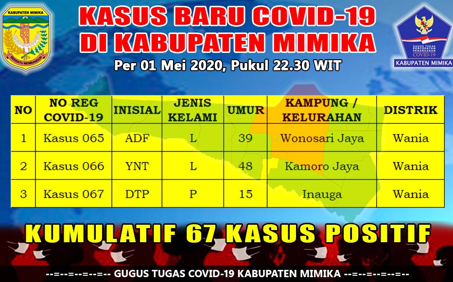 Dengan tambahan tiga kasus baru, menurut Reynold yang sebelumnya berjumlah 64 kini bertambah secara kumulatif menjadi 67 kasus positif di kabupaten Mimika.