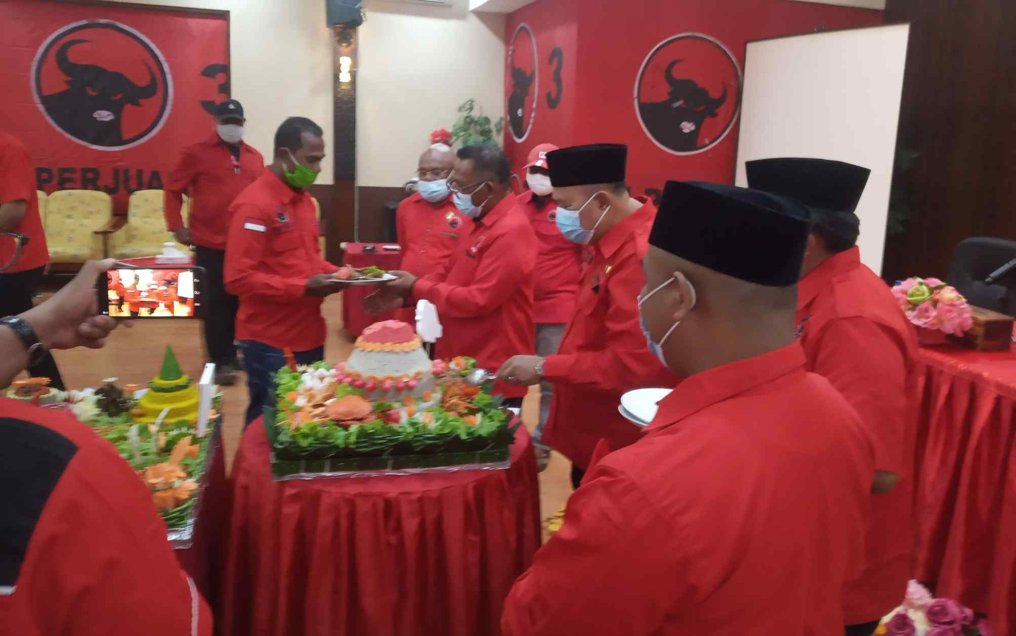 “Sebentar kami akan serahkan kepada beberapa teman dan tolong diteruskan ke masyarakat kita. Karena budaya tumpeng ini menandakan hubungan kekeluargaan dan juga masyarakat sudah percayakan kami di partai untuk bagaimana kita memperjuangkan kesejahteraan mereka,” ungkapnya.