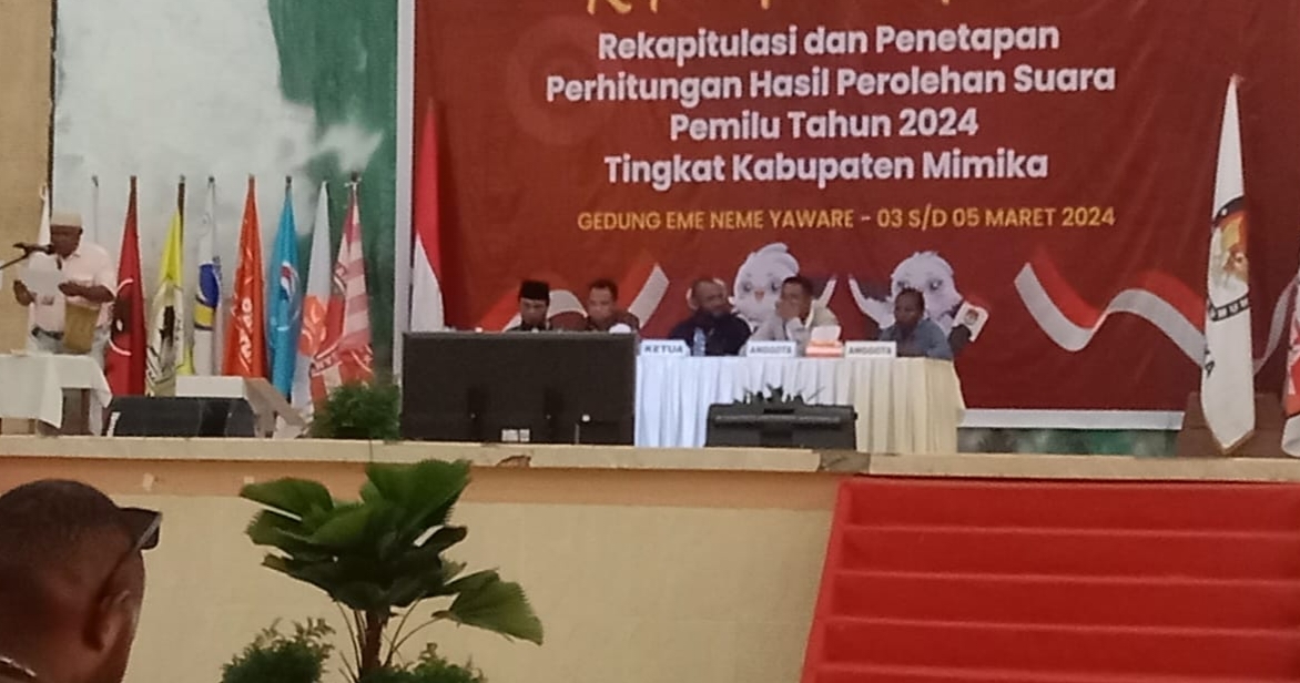 Perolehan suara ini terungkap dalam rapat pleno terbuka rekapitulasi dan penetapan perhitungan hasil perolehan suara pemilu tahun 2024 tingkat Kabupaten Mimika khusus untuk Panitia Pemilihan (PPD) Mimika Timur (Miktim) yang dibacakan oleh Ketua PPD Distrik Mimika Timur, Muhammad Muri yang disaksikan oleh Lima Komisioner KPU Mimika, Dete Abugau, dan Komisioner lainnya, Fransiskus Xaverius Ama Bebe Bahy (Divisi Teknis), Hironimus Kia Ruma (Divisi Hukum), Budiono (Divisi Data) dan Delince Somou (Divisi Logistik), anggota Komisioner Bawaslu, para Saksi dan tim pemantau pemilu, di Gedung Eme Neme Yauware, Minggu (3/3/2024) malam. (Opa)