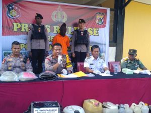 Kapolres Mimika,AKBP I Gede Putra, menggelar konferensi pers penangkapan pelaku pembuat minuman keras lokal di wilayah Mimika Timur, Rabu (7/12/2022). Foto : Marsel Balawanga