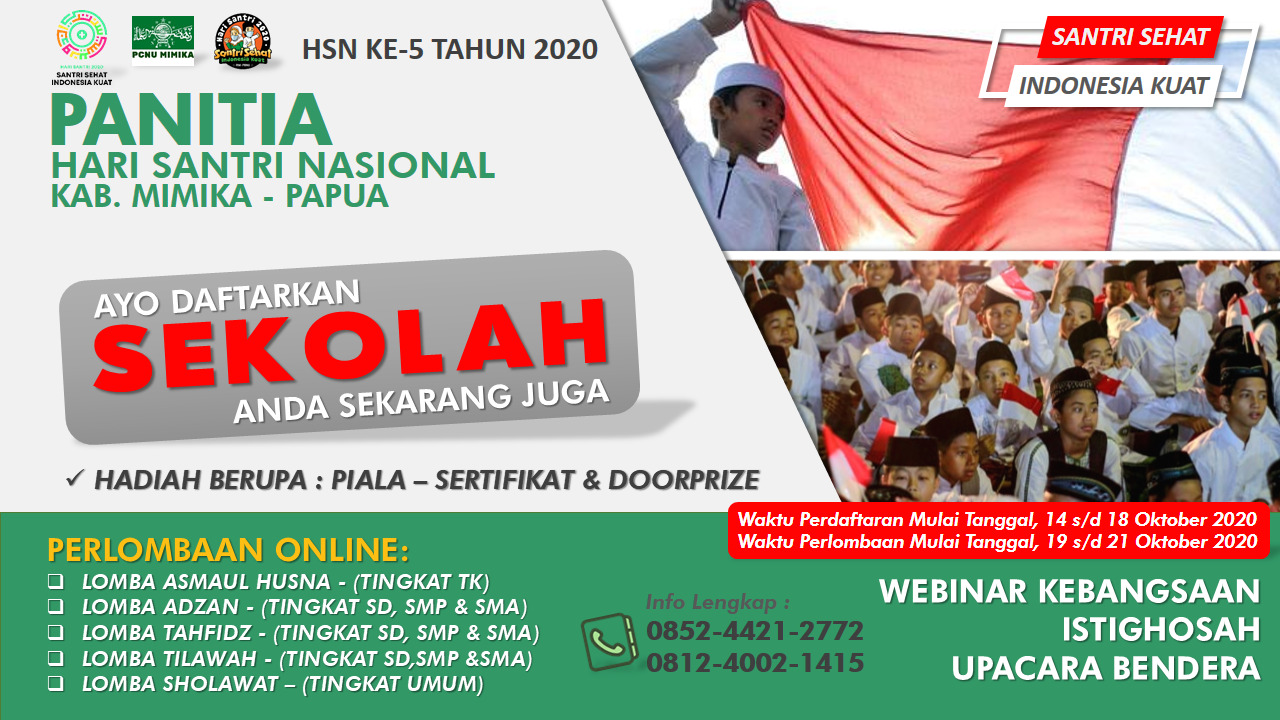TIMIKA, (timikabisnis.com) – Sejumlah kegiatan dan lomba akan mewarnai puncak peringatan Hari Santri Nasional (HSN) ke 5 di kabupaten Mimika, Papua yang akan jatuh pada tanggal 22 Oktober 2020 mendatang.