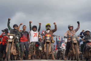 PJ Bupati bersama Forkompinda, Ikatan Motor Indonesia (IMI) Kabupaten Mappi serta sejumlah organisasi masyarakat. Dengan penuh semangat berjalan menempuh jarak 20 Kilo meter (KM) untuk membagikan bendera merah putih kepada masyarakat yang berdomisili di kampung – Kampung,Minggu (07/08/2022)/Foto : Istimewa