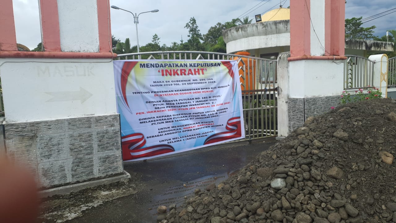 Mereka melakukan pemalangan dengan membuang pasir timbunan persis di depan pintu gerbang utama, dan menutup pintu serta memasang sebuah spanduk ukuran besar bertuliskan, “Mendapatkan Keputusan Inkraht maka SK Gubernur Nomor 155/266 tahun 2019 tertanggal 14 September 2019 tentang peresmian keanggotaan DPRD Mimika dinyatakan Gugur Demi Hukum”.