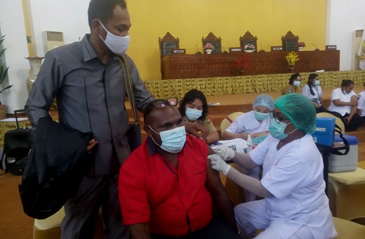 Ketua DPRD Mimika, Robby K Omaleng,S.IP, MA saat di vaksin ke 2 oleh tim medis dari Dinas Kesehatan, di ruang Paripurna Kantor DPRD Mimika, Senin (19/4)/Foto : husyen opa