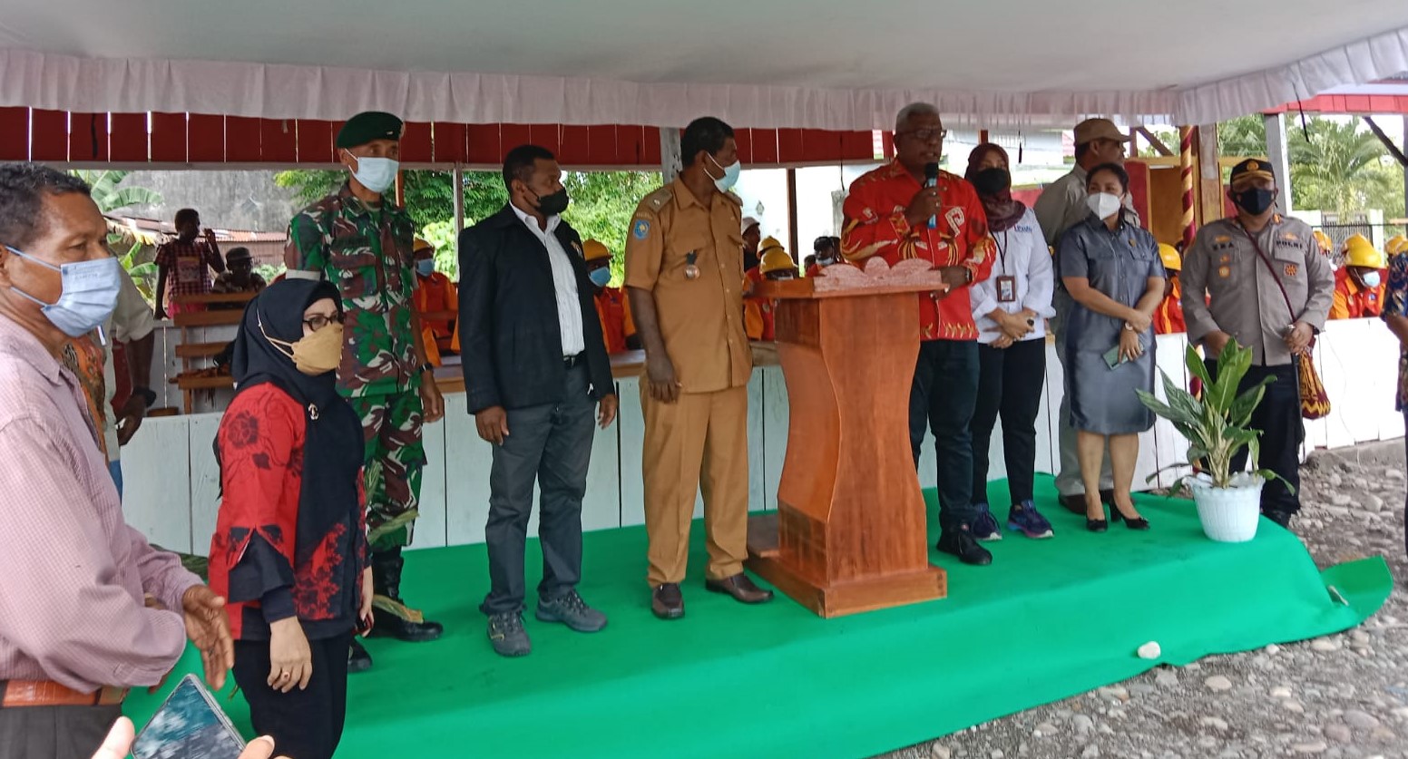 Wakil Bupati Mimika, Bapak Johannes Rettob, S.Sos,. MM dan Kepala Seksi Pelaksanaan Balai Jasa Konstruksi Wilayah VII Jayapura Ibu Dwi Retni Wardani ST. M.Eng, dan Kapolres Mimika AKBP IG Era Adhinata dan para Pimpinan Forkopimda dan Undangan saat menghadiri Loucnhign BLK Merah Putih di Kampung Nawaripi, Sabtu (15/1/2022)/Foto : husyen opa