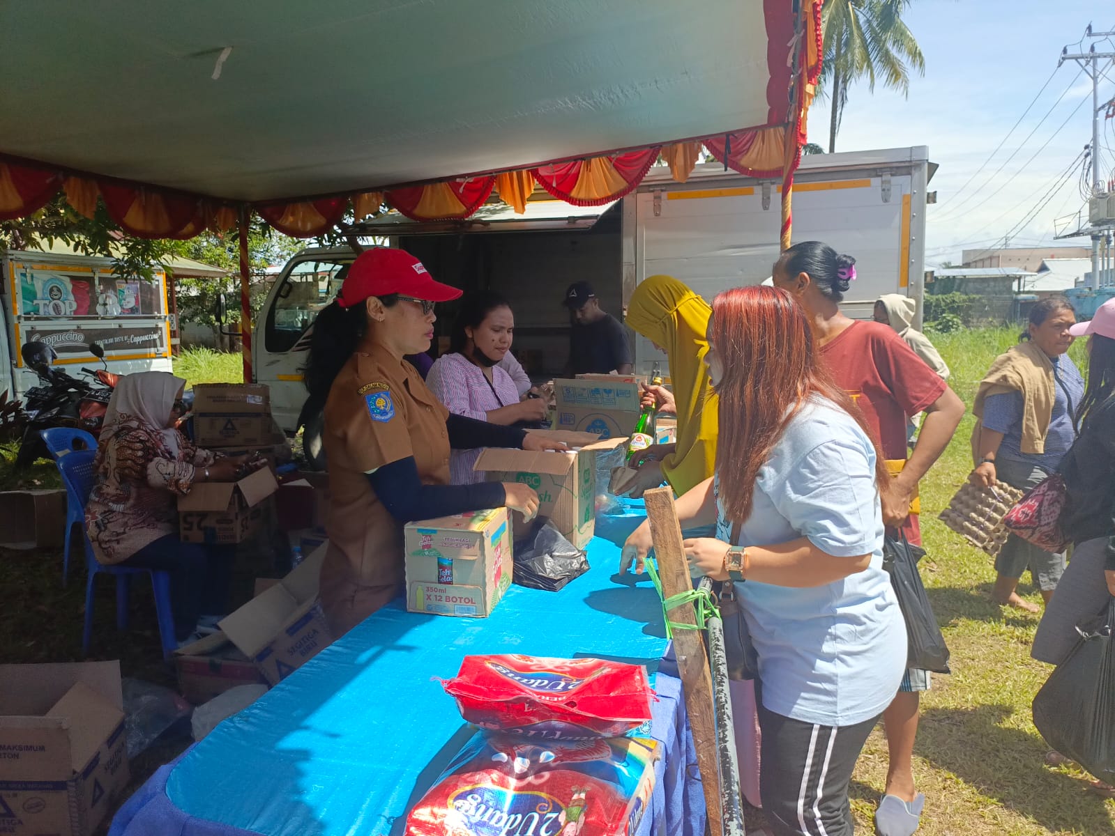 Staff Dinas Perindustrian dan Perdagangan Kabupaten Mimika saat melayani masyarakat yang akan membeli dalam kegiatan Pasar Murah di Kwamki Baru Timika, Selasa (31/10/2023)/Foto : husyen opa