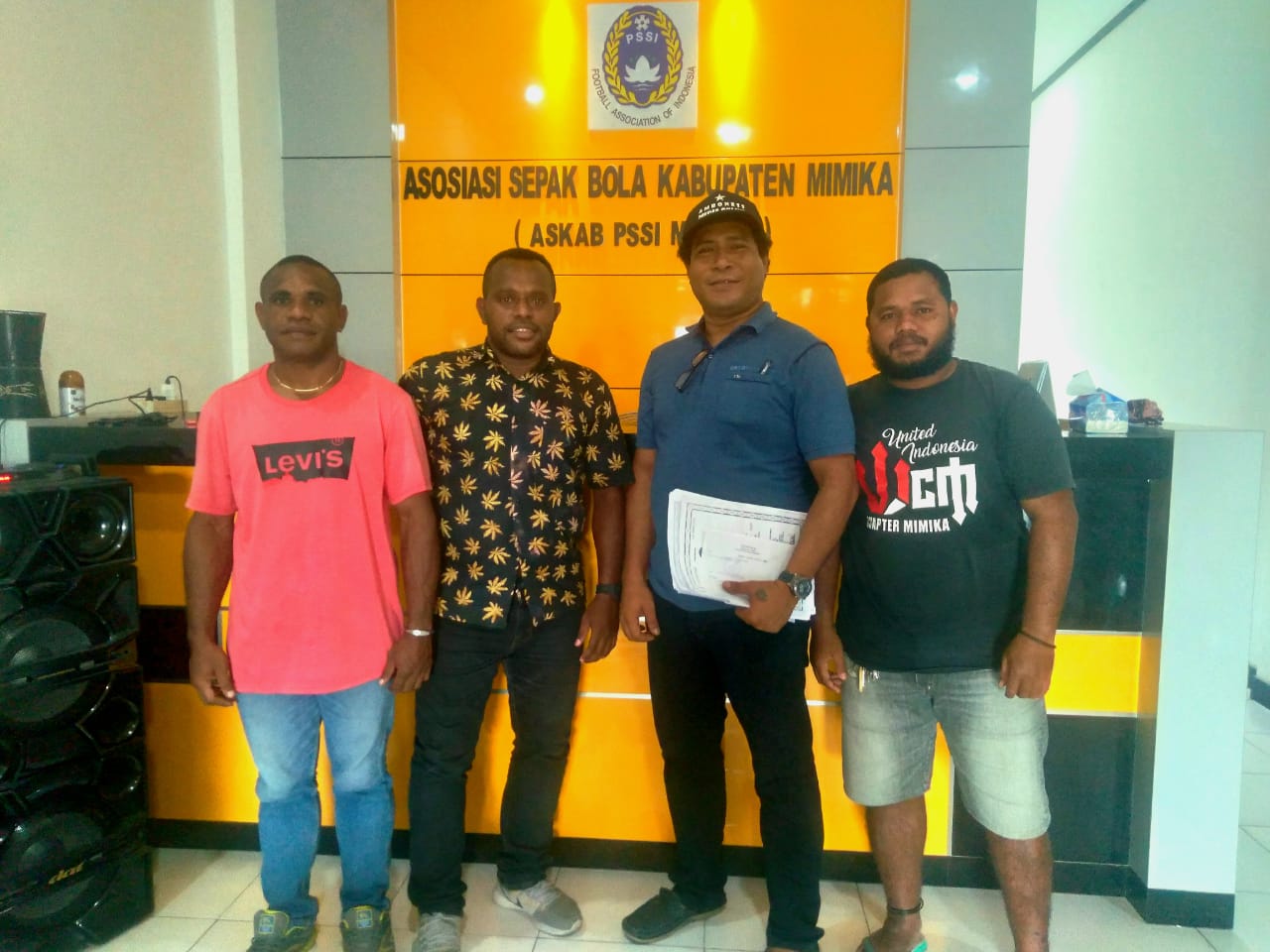 Koordinator Bidang Pendaftaran dan Administrasi Askab Christmas Soccer Competition 2021 , Glend Wattimury (dua dari kanan) bersama panitia pelaksana lainnya di Sekretariat Askab PSSI Mimika di Jalan hasanudin Timika, Rabu (8/12/2021) /Foto : husyen opa