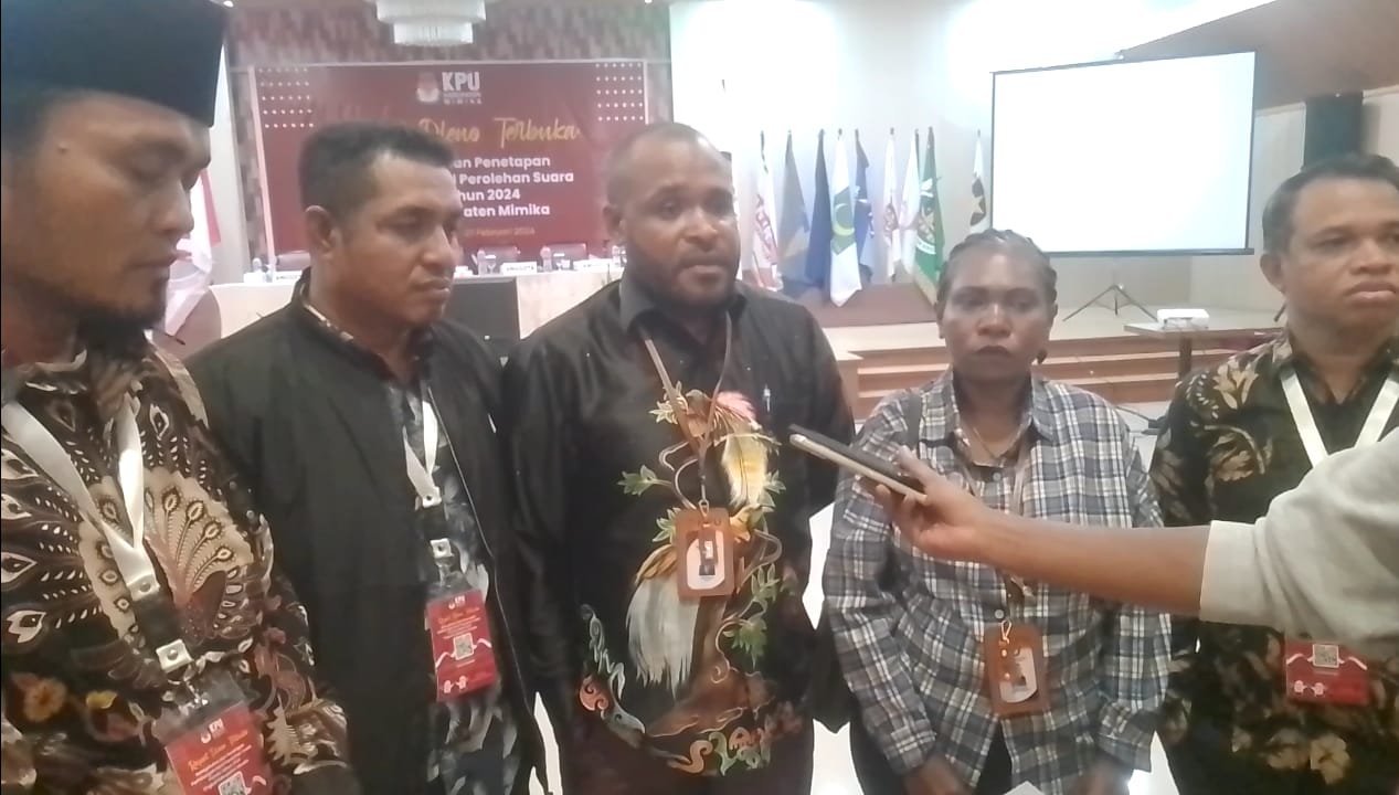 Hal tersebut ditegaskan Ketua KPU Mimika, Dete Abugau yang didampingi oleh komisioner lainnya, Fransiskus Xaverius Ama Bebe Bahy (Divisi Teknis), Hironimus Kia Ruma (Divisi Hukum), Budiono (Divisi Data) dan Delince Somou (Divisi Logistik), saat memberikan keterangan pers kepada wartawan usai menskor Rapat Pleno Terbuka Rekapitulasi Tingkat Kabupaten di Hotel Cartenz Timika, Jumat (1/3/2024) siang tadi.