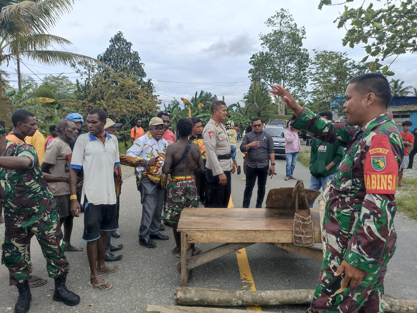 Sejumlah aparat dari Polsek Mimika Timur dan Koramil serta anggota DPRD Komisi C yang kebetulan melintas pun turun dan meminta warga segera membuka palang tersebut.