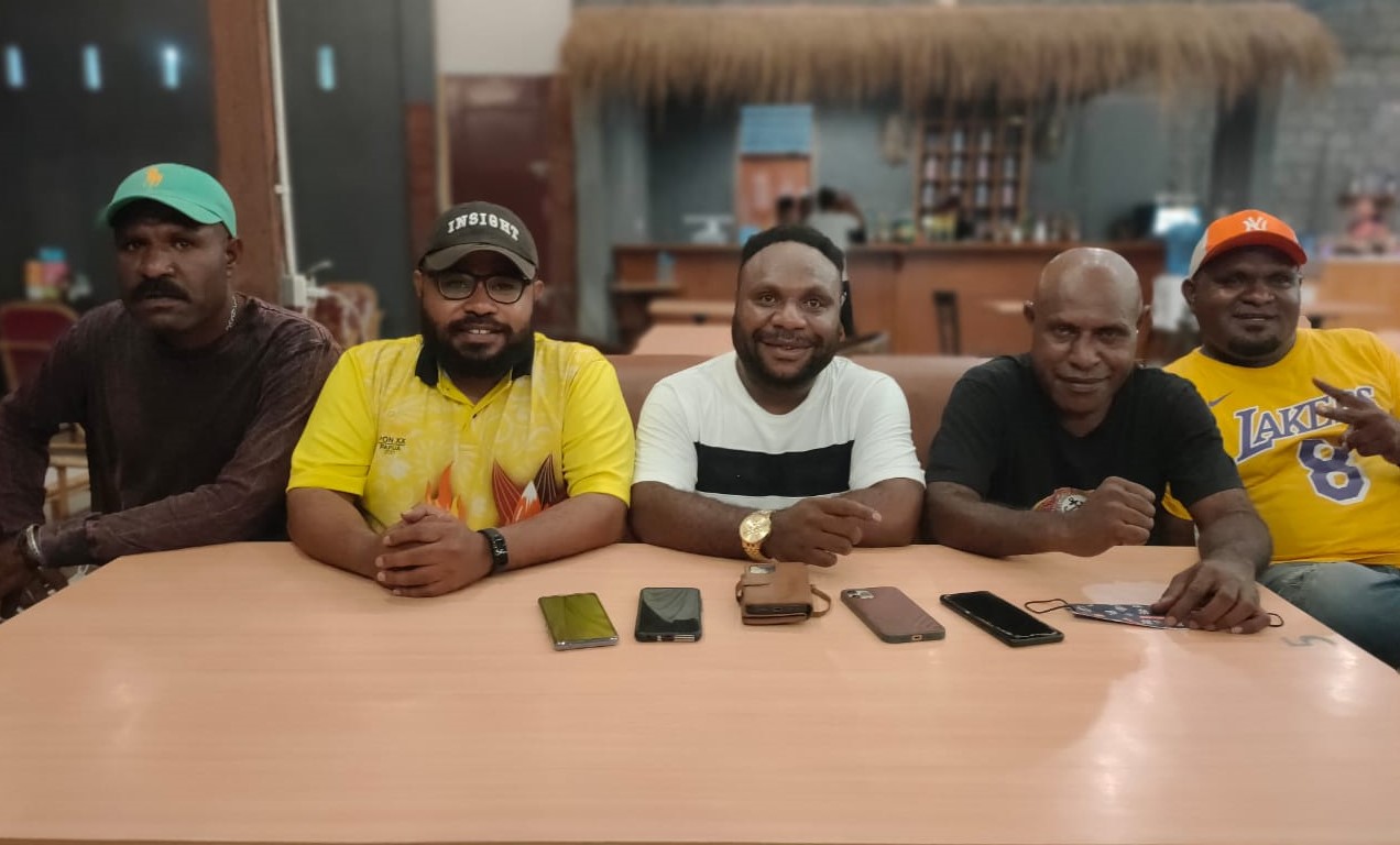 Manager Persemi Mimika Alexander Omaleng (tengah), didampingi tim offisial lainnya Fransiskus Kemong (dua dari kiri), Natalis Natex Bukaleng (paling kiri), Imanuel Manu Ananim (dua dari kanan) dan Markus Dibitau (paling kanan) saat memberikan keterangan pers kepada wartawan di Jayapura, Jumat (19/11/2021)/Foto : husyen opa