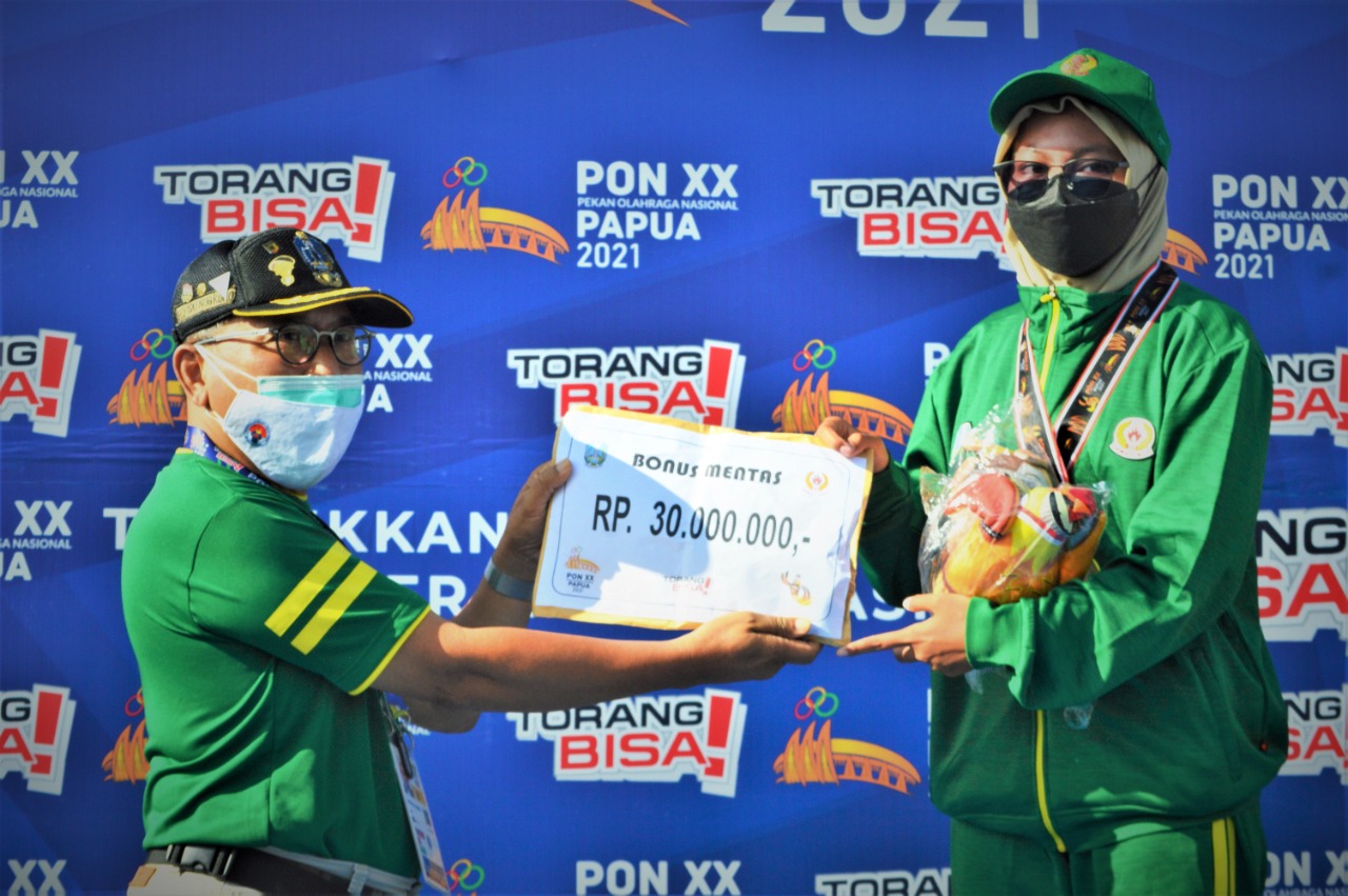 Yudo Nugroho, Perwakilan KONI dari Jawa Timur memberikan Bonus Mentas kepada Atlet Aeromodelling Putri Jawa Timur, Dicka Cahya Putri di venue Aeromodeling SP-5 Timika.(FOTO: Lukas Tandilimbong)