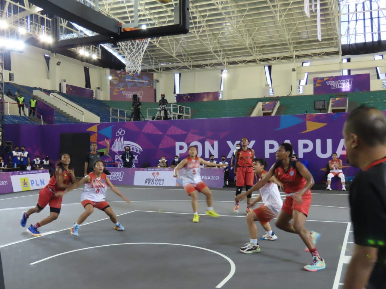 Pertandingan Basket 3×3 antara Tim Basket Putri Papua (Kostum merah) mengalahkan Tim Sumatera Barat (Kostum putih oranye), skor 10 – 21, bagi kemenangan Putri Cenderawasih, dalam laga penyisihan Cabor Basket 3x3putri di Venue Basket Mimika Sport Complex, Selasa sore (12/10/2021). Foto: Humas PPM/ Victory Tobias.