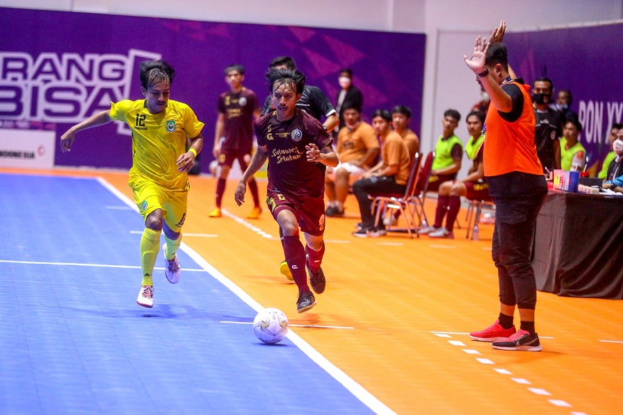 TIMIKA, (timikabisnis.com) – Pemain PON Futsal Provinsi Sulawesi Selatan (Sulsel) Aldi bernomor punggung 5 berhasil melewati pemain bertahan dari Tim Futsal PON Maluku Utara bernomor punggung 12 Ambri Abdul Aziz Barady dalam laga babak penyisihan Pool A Cabang Olahraga Futsal PON XX Papua yang berlangsung di GOR PON XX Klaster Mimika, Papua, Jumat (24/9/2021). Dalam laga ini, Tim Futsal Sulawesi Selatan berhasil menunddukkan Maluku Utara dengan skor 4-1. Dan pagi ini sedang berlangsung di Pool A , dimana tim Futsal Sulsel sedang berhadapan dengan tim Futsal Jawa Timur dan skor sementara 1 -0 unggul Sulawesi Selatan dan masih berlangsung.