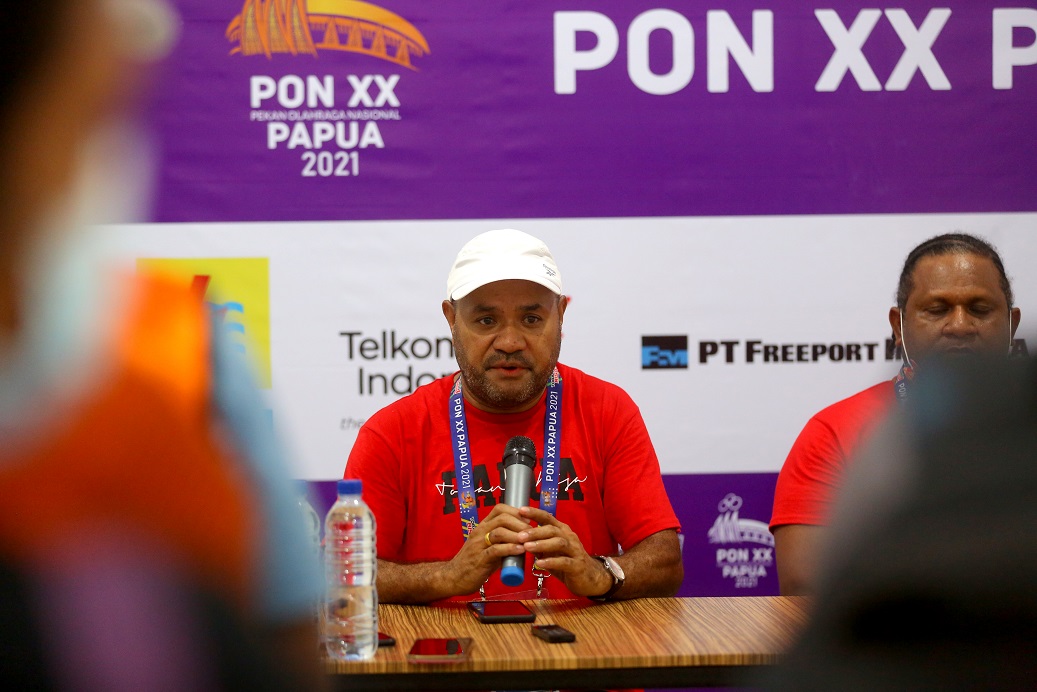 Pelatih Kepala Tim Futsap PON Papua, DAUD H ARIM, Berterima kasih kepada masyarakat Timika karena sdh menjadi pemain ke 6 (supporter) di laga Papua vs NTB, Timika, Sabtu (25/9/2021). Hal ini disampaikan saat conference pers usai pertandingan dimana Tim Futsal Papua menang 3-2 atas Tim NTB, di GOR Futsal PON Papua Timika /Fotografer : Fernando Rahawarin