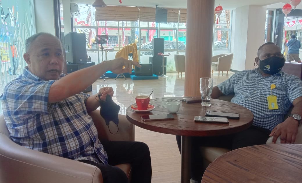 Dua pimpinan DPRD Mimika Periode 2019-2024 Wakil Ketua I, Aleks Tsenawatme,S.AB (kiri) dan Wakil Ketua II, Yohanis Felix Helyanan,SE saat memberikan keterangan kepada wartawan di Grand Tembaga Hotel, Selasa (7/9/2021)/Foto : istimewa