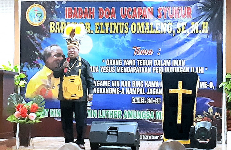 Sebagaimana dikutip dari laman, https://diskominfo.mimikakab.go.id, Bapak Eltinus Omaleng begitu memasuki rumah ibadah langsung berlutut di depan altar, menundukkan kepala dan memejamkan mata, sementara para Pendeta mengelilinginya mengangkat tangan sambil menyanyikan pujian “Ajaib Tuhan” serta berdoa mengucap syukur dan akhirnya disambut pelukan para Pendeta serta keluarga usai berdoa.