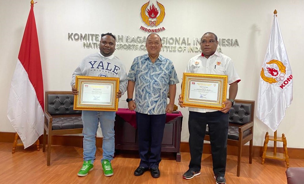 Eltinus Omaleng – Cesar Avianto dan KONI Mimika Terima Penghargaan dari KONI Pusat