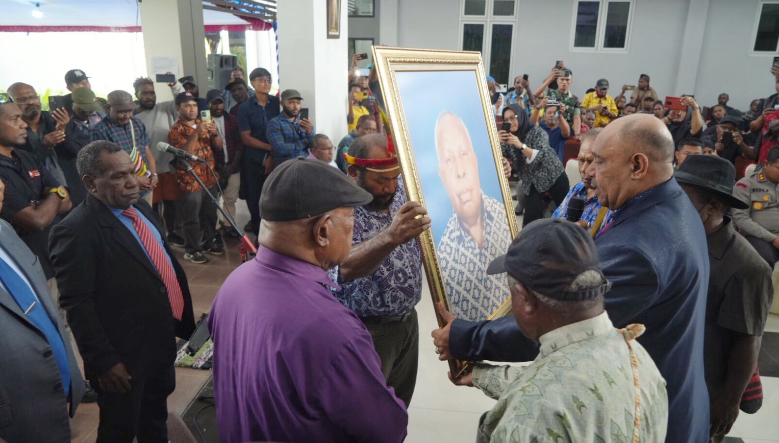 TIMIKA – (timikabisnis.com) Proses penyerahan Jenasah Tokoh Papua, Tom Beanal dari keluarga Masyarakat Adat Amungme-Kabupaten Mimika-Papua Tengah, yang diwakili oleh Piet Magal kepada Dewan Presedium Papua, Sabtu (3/6/2023) di Kapela Keusukupan Timika, Kabupaten Mimika. Ribuan Keluarga, Masyarakat dan warga Kabupaten Mimika mengantar Jenasah Tokoh Masyarakat Tom Beanal dengan berjalan kaki dari Keuskupan Timika menuju Gereja Katedral Tiga Raja Timika, di Jalan Yos Sudarso Timika, Kabupaten Mimika-Papua Tengah. Rencana pemakaman dilaksanakan di Mile 32 Timika, siang ini Sabtu (3/6/2023)/PEWARTA FOTO : FERNANDO RAHAWARIN
