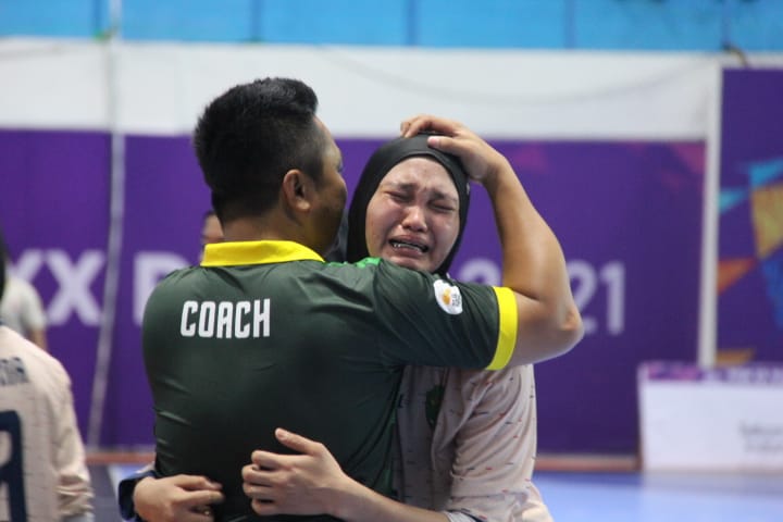 Pemain Handball Kaltim, Sri Nurlinda penuh emosional, usai menangkan laga melawan DKI Jakarta, Rabu (13/10). (FOTO: Humas PPM/Mayero C Sarioa)
