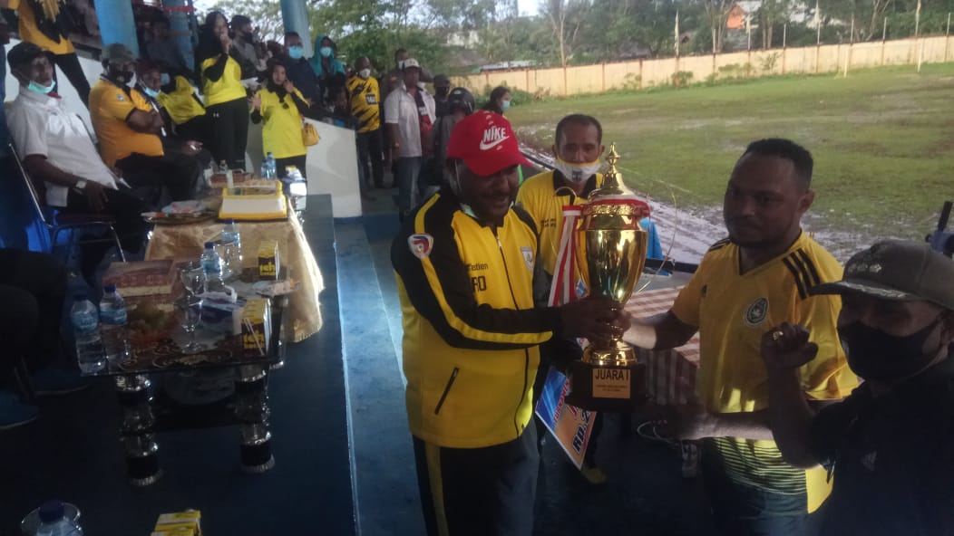 Ketua Askab PSSI Mimika, Robby K Omaleng,S.IP,MA saat menyerahkan tropy Juara Pertama turnamen Sepakbola Askab PSSI Mimika kepada kapten Kesebelasan Distrik Wania, Ichad Yarangga.