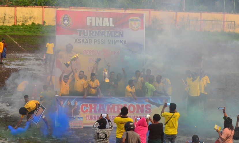 TIMIKA,(timikabisnis.com) – Dipartai puncak turnamen sepakbola Askab PSSI Mimika dalam rangka HUT Kabupaten Mimika ke 24, akhirnnya kesebelasan dari Distrik Wania A keluar sebagai juara pertama setelah mengalahkan kesebelasan dari Distrik Jita A dalam laga final yang berlangsung, Kamis (8/10) di stadion Wania Imipi SP I, Kelurahan Kamoro Jaya, Distrik Wania, Kabupaten Mimika.