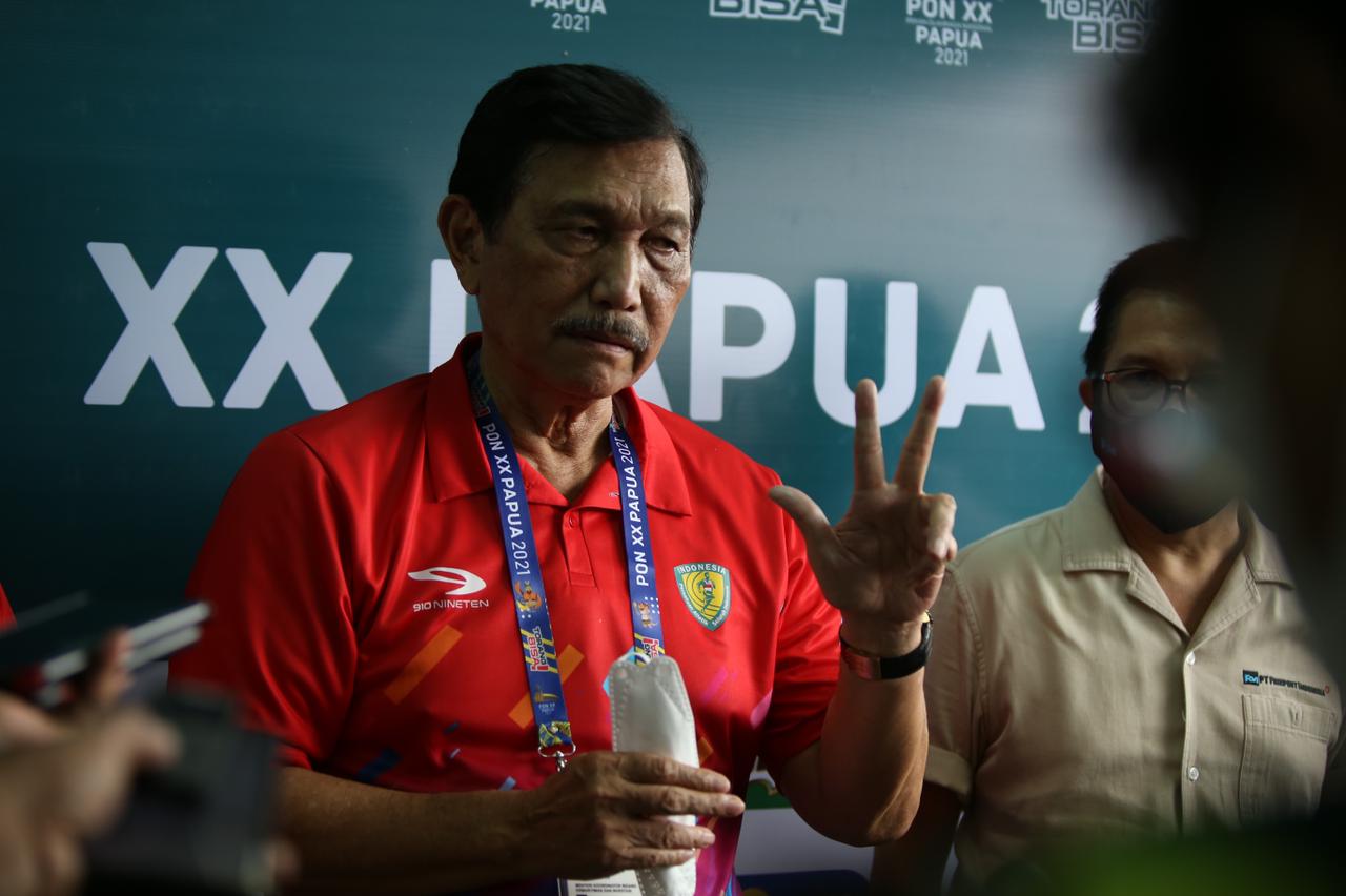 Luhut Binsar Panjaitan saat memberikan keterangan kepada awak media di arena atletik Mimika Sport Complex, Selasa (5/10/2021). Foto:Humas PPM/Joseph Situmorang
