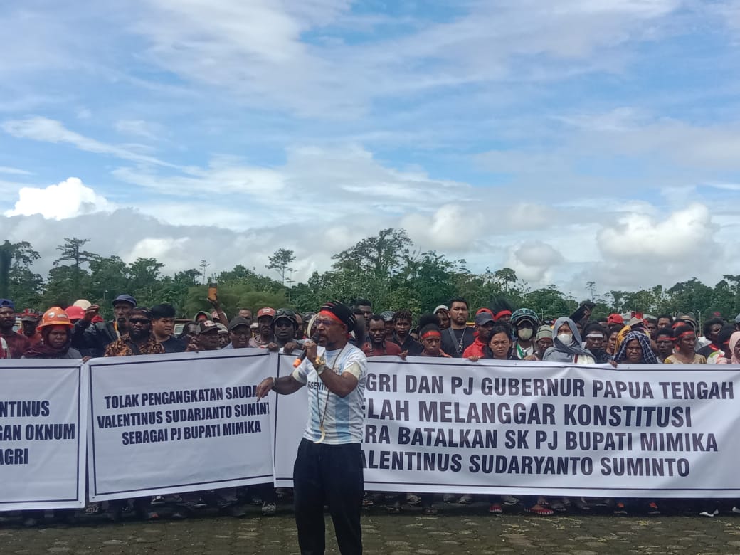 Ketua Lemasa Karel Kum dalam Orasinya mengatakan menolak Pj Bupati yang baru Valentimus Sudarjanto yang dilantik oleh Penjabat Gubernur Papua Tengah Ribka Haluk, karena Plt Johannes Rettob masih sah sebagai Pemimpin kabupaten Mimika.
