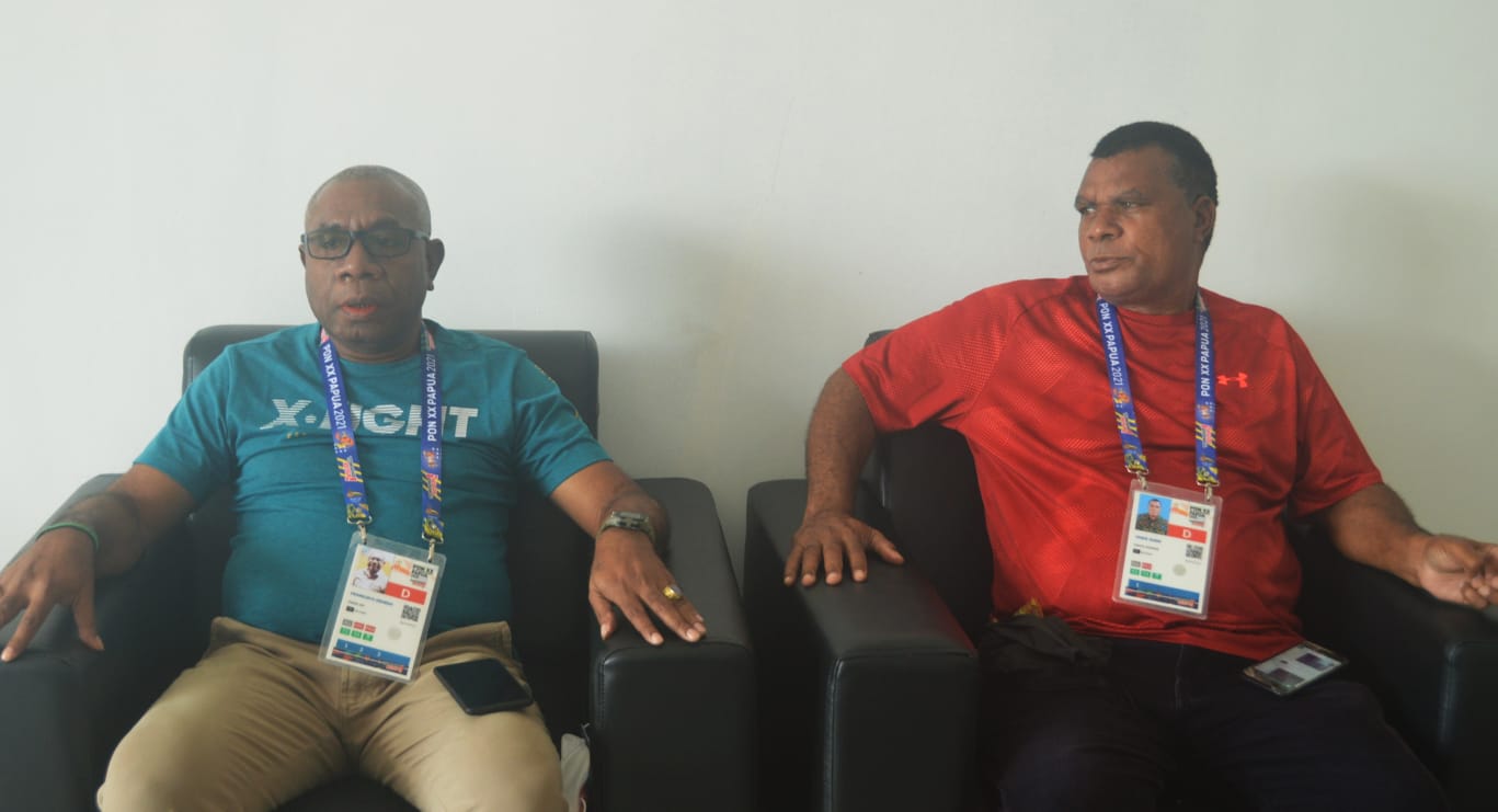 Ketua Panpel Handball, Franklin O. Demena (Kiri) didampingi anggota Panpel Handball, Yance Susim saat memberikan keterangan di venue Handball, Kamis (7/10)./ FOTO: HumasPPM/Mayero C Sarioa