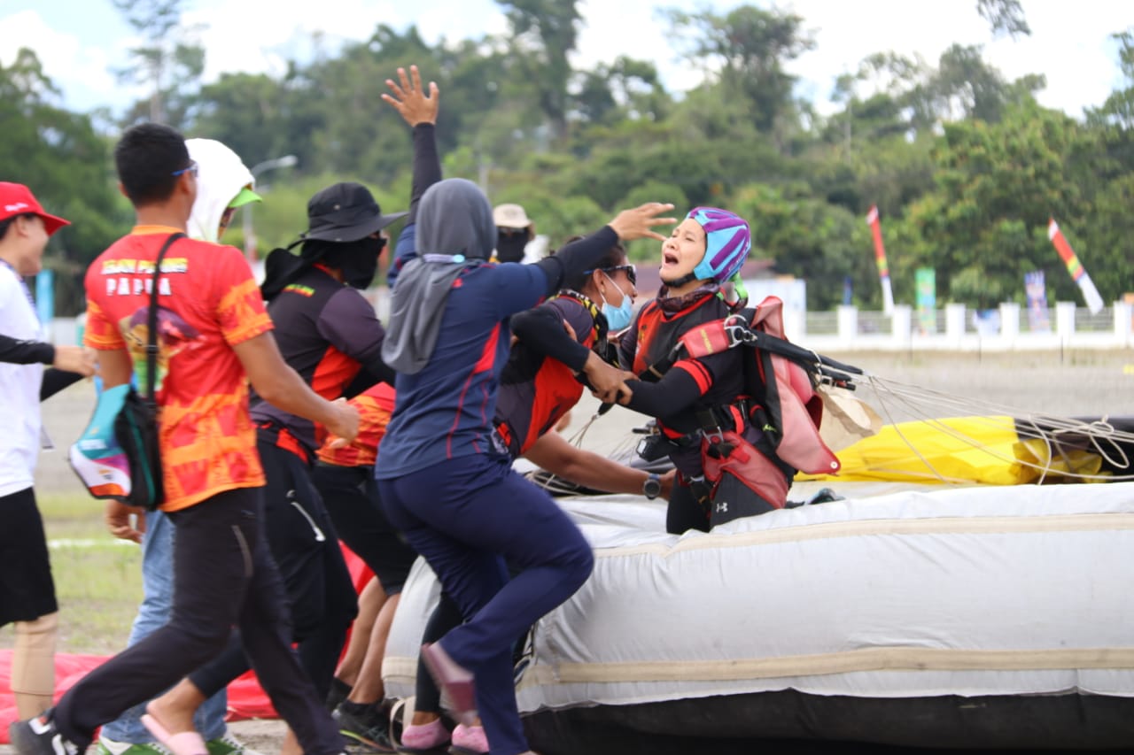 Ni Putu Irma Purnama Dewi usai melakukan pendaratan cabang olahraga terjun payung PON XX nomor ketepatan mendarat perorangan putri, Rabu (13/10/2021), di venue terjun payung halaman kantor pusat pemerintahan Kabupaten Mimika. Setelah mendarat mulus, Ni Putu Irma langsung disambut rekan-rekannya lantaran memperoleh nilai tertinggi dan berhak menerima medali emas./Foto: Saldi Hermanto/Humas PPM