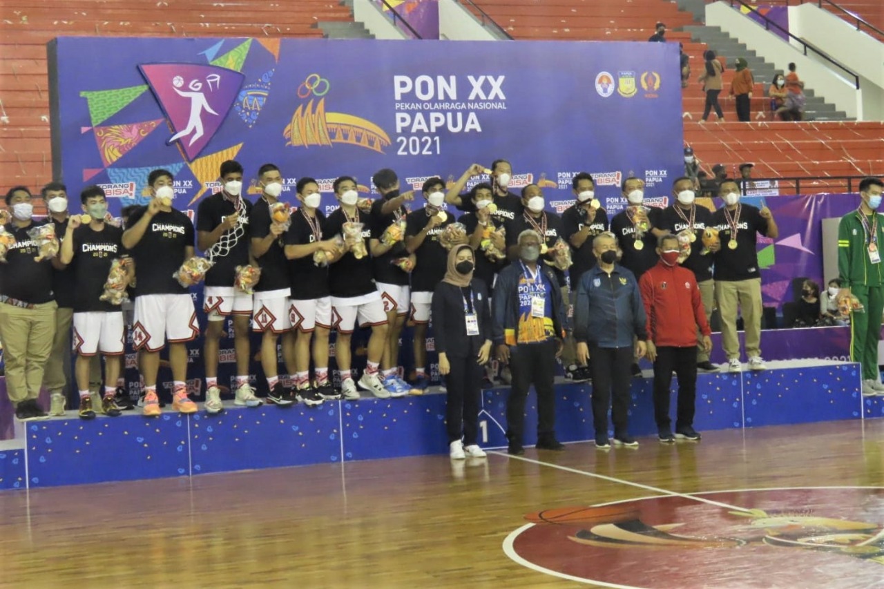Tim Basket DKI Jakarta yang raih medali emas di podium kehormatan foto bersama Ketua Perbasi, Danny Kosasih, Wakil Bupati Mimika, Johannes Rettob, di Venue Basket Mimika Sport Complex, Sabtu malam (09/10/2021). Foto: Humas PPM/ Victory Tobias.