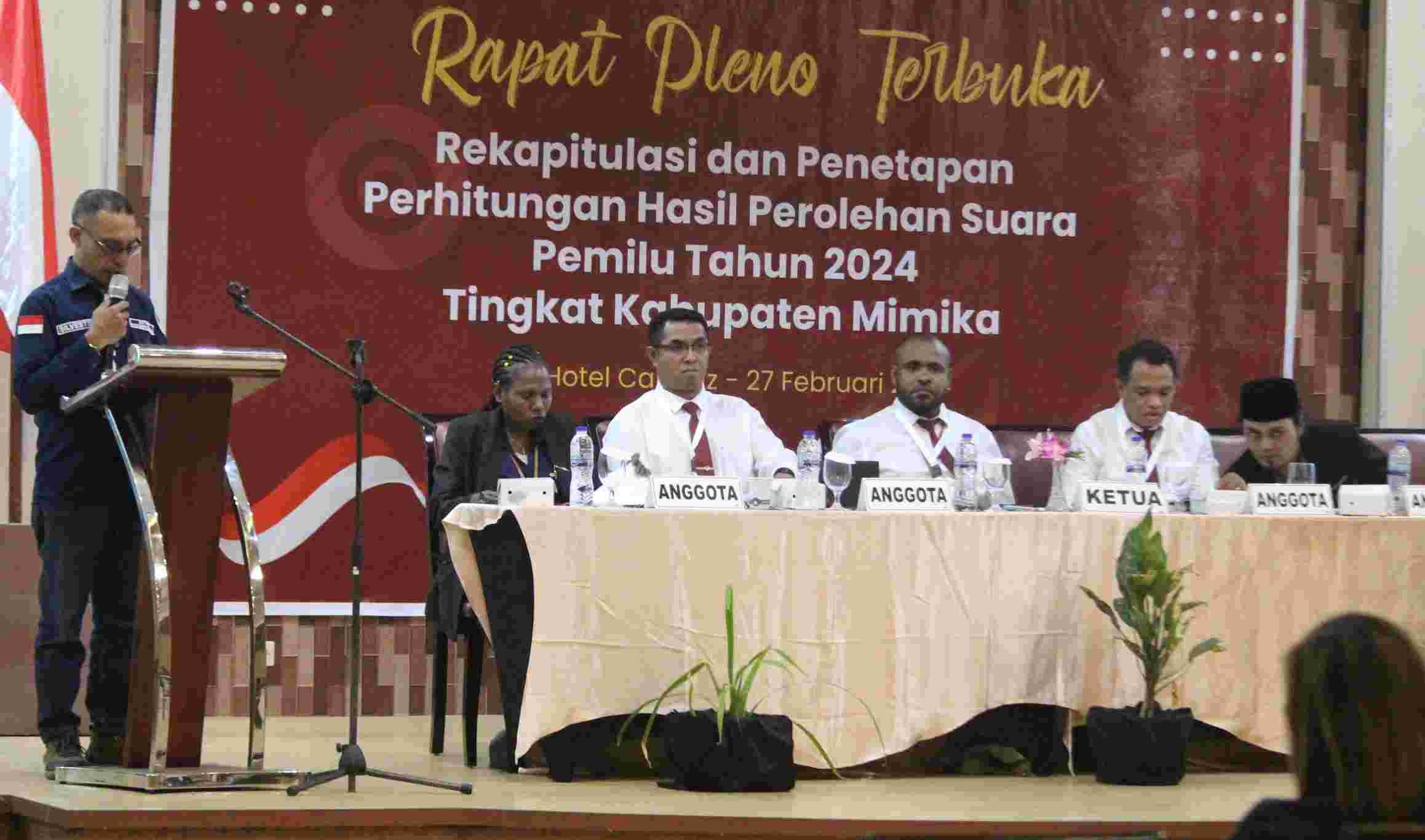 TIMIKA, (timikabisnis.com) – Rapat Pleno terbuka oleh Komisi Pemilihan Umum (KPU) Kabupaten Mimika, Provinsi Papua Tengah dengan agenda Pembacaan hasil Rekapitulasi Perhitungan dan Penetapan Hasil Perolehan Suara khusus untuk PPD Mimika Tengah (Distrik Mimika Tengah), Calon anggota Legislatif Daerah Pemilihan (Dapil) 6 yang digelar pada Selasa (27/2/2024) di Hotel Cartenz Timika, kabupaten Mimika, Papua Tengah.