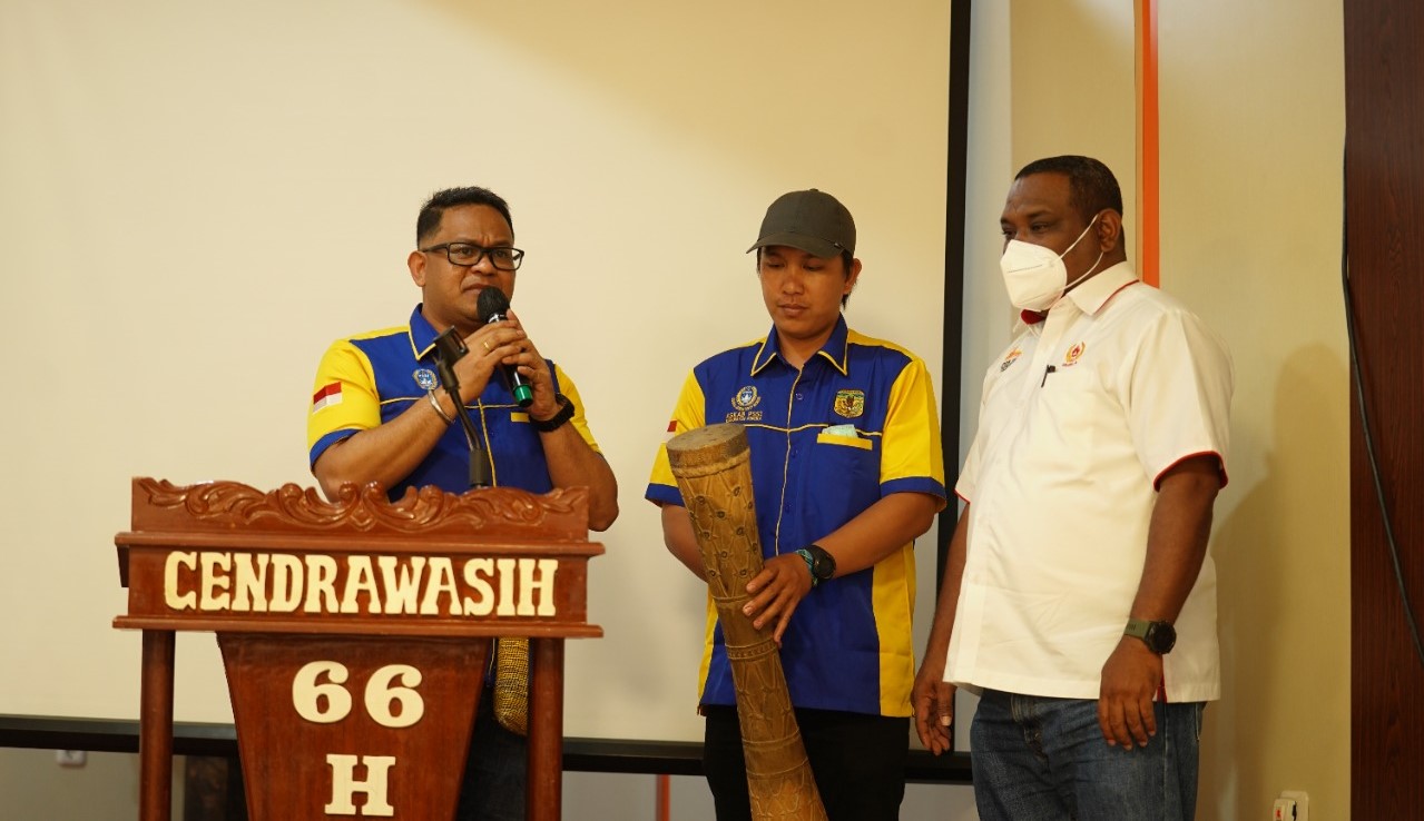 Ketua Askab PSSI Mimika Michae R Gomar,S,STP, (kiri), Sekretrais Umum KONI MImika Cesar Avianto Tunya,SH,MH,M.SI (kanan) saat menutup Raker I Askab PSSI Mimiak yang ditandai dengan pemukulan tifaa/Foto : humas Askab PSSI Mimika