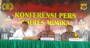 Kapolda Papua, Irjen Pol Mathius D. Fakhiri (tengah) didamping Kabid TIK Polda Papua,Kombes Pol I Gusti era Adhinata dan Kapolres Mimika AKBP I Gede Putra saat memberikan keterangan pers di Kantor Pelayanan Polres Mimika, Rabu (11/1/2023)/Foto : istimewa