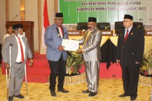 Ditandai dengan penyerahan materi APBD Mimika tahun 2023 dari Ketua DPRD Mimika, Anton Bukaleng kepada Plt Bupati Mimika, Johannes Rettob,S,Sos,MM./Foto : husyen opa
