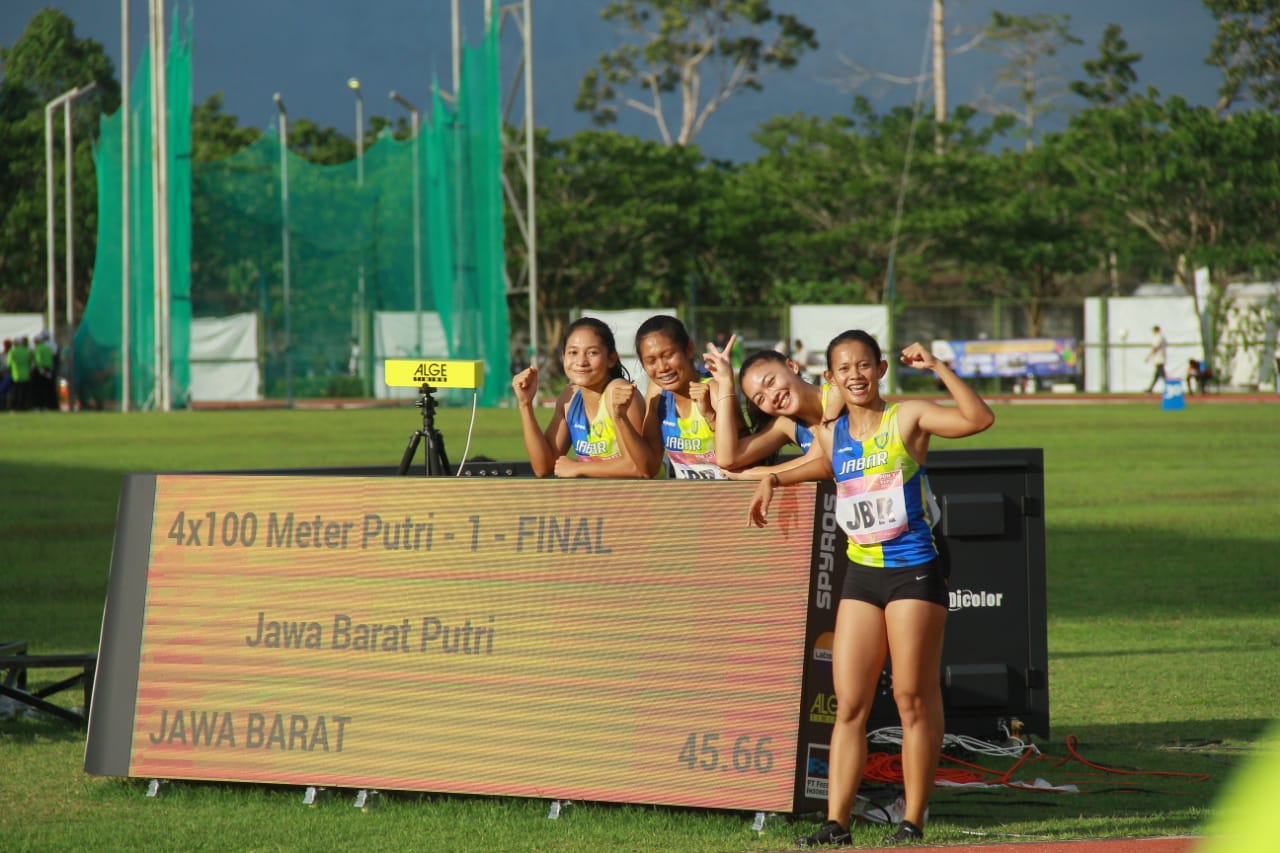 Tim estafet putri 4×100 meter Jawa Barat berpse usai berhasil menjadi urutan pertama nomor 4×100 meter di Vanue Atletik Mimika Sport Complex, Rabu (13/10/2021). Foto: David Lalang/Humas PPM)