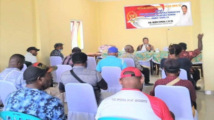 Timika, (timikabisnis.com) –Sosialisasi Empat Pilar Kebangsaan terus dilakukan. Program dari MPR RI tersebut merupakan pembelajaran bersama masyarakat untuk mengerti apa itu Pancasila, UUD 1945, NKRI dan Bhineka Tunggal Ika, agar terwujud pemahaman masyarakat tentang kehidupan berbangsa dan bernegara dan dapat diaplikasikan di kehidupan sehari-hari. Kali ini Anggota MPR RI/DPD RI Dapil Provinsi Papua, Pdt. Ruben Uamang S.Th., M.A, menggelar Sosialisasi Empat Pilar MPR RI bersama masyarakat Mimika, Papua yang dilakukan di Gedung Tongkonang, Jl. Samratulangi, Mimika, Provinsi Papua.