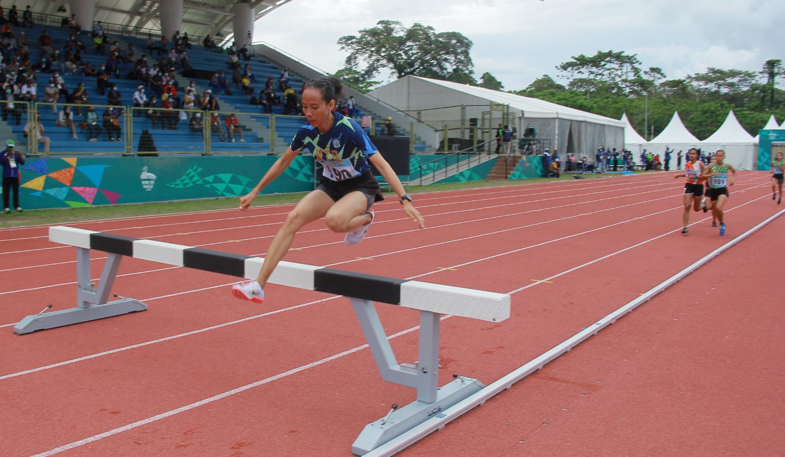 Atlet Nusa Tenggara Barat, Dian Ekayanti keluar sebagai yang tercepat dan berhak atas medali emas pada nomor lari 3000 meter halang rintang putri PON XX di arena atletik MSC, Kamis (14/10/2021). Foto: Humas PPM/ David La’lang